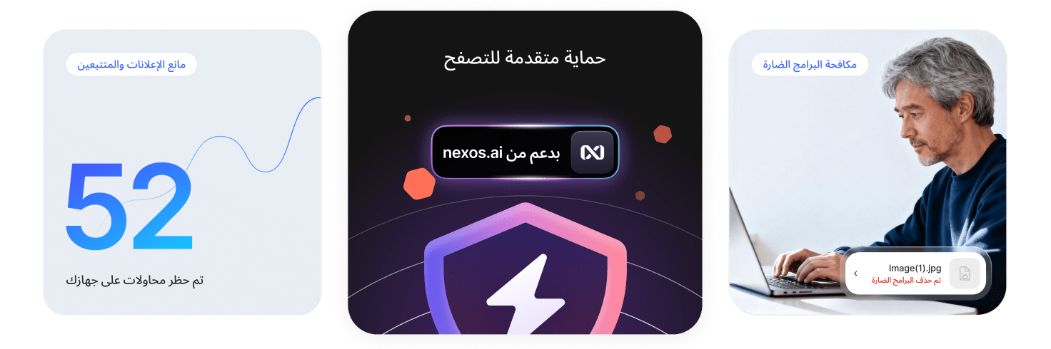 بفضل الحماية من التهديدات Pro™، ستتمتّع بتصفح أكثر أمانًا وسرعة من دون فوضى بصرية. احظر الإعلانات وامنع المتتبعين من تتبعك عبر الإنترنت وجمع البيانات عنك.