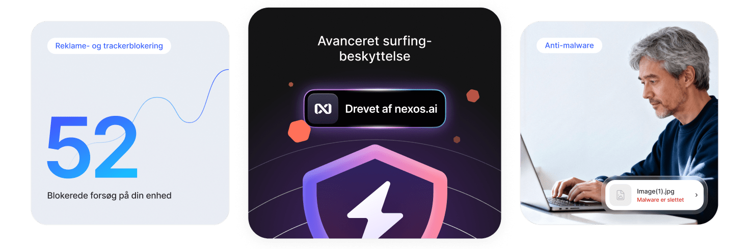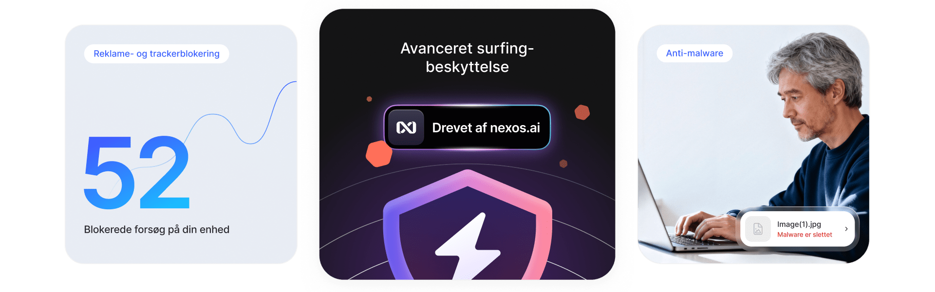 Threat Protection Pro™ er et kraftfuldt, effektivt og let antivirusværktøj. Det er en cybersikkerhedsfunktion, der er integreret direkte i NordVPN-appen, og som gør din browsing mere sikker og problemfri, samtidig med at den beskytter dig mod phishing og andre cybertrusler. Se, hvad vores mest avancerede funktion har at byde på.