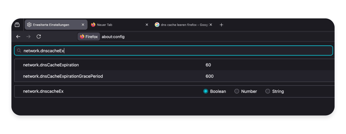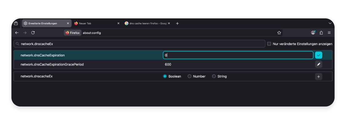 - 4.Suche im Suchfeld oben nach „network.dnsCacheExpiration“.