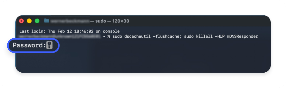 - 4.Gib dein Passwort ein und drücke die „Enter“-Taste. Wenn du erfolgreich warst, siehst du eine Meldung, die besagt, dass du deinen DNS-Cache zurückgesetzt hast.