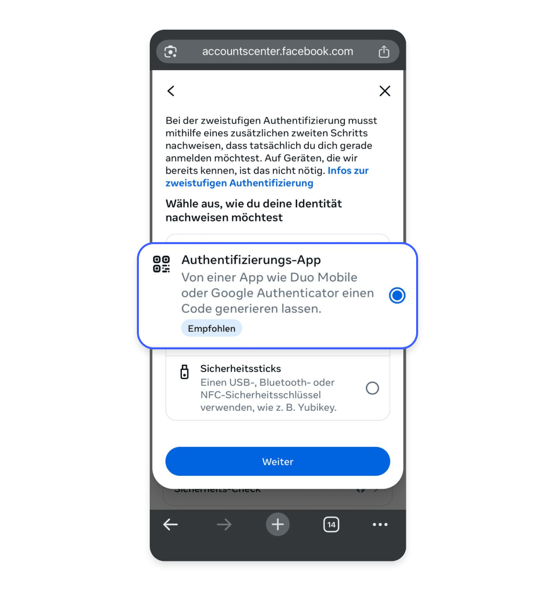 - 3.Nachdem du die Authenticator App heruntergeladen hast, wähle „Weiter“ (Next).