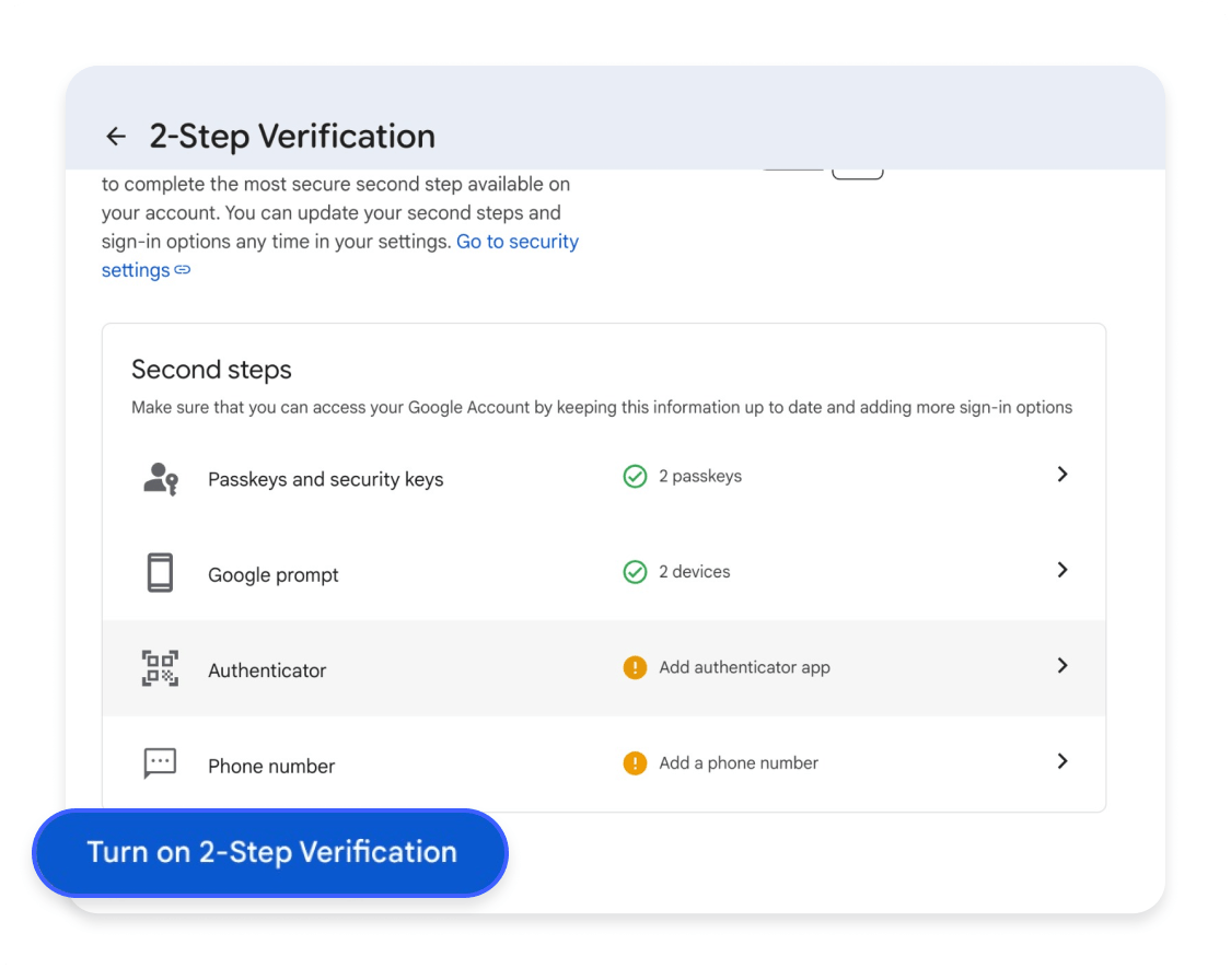 - 5.Nach der Passworteingabe führt dich Google durch die Einrichtung. Du kannst zwischen verschiedenen Methoden wählen: Google-Aufforderungen (Prompts), Authenticator-App, Passkeys oder SMS.