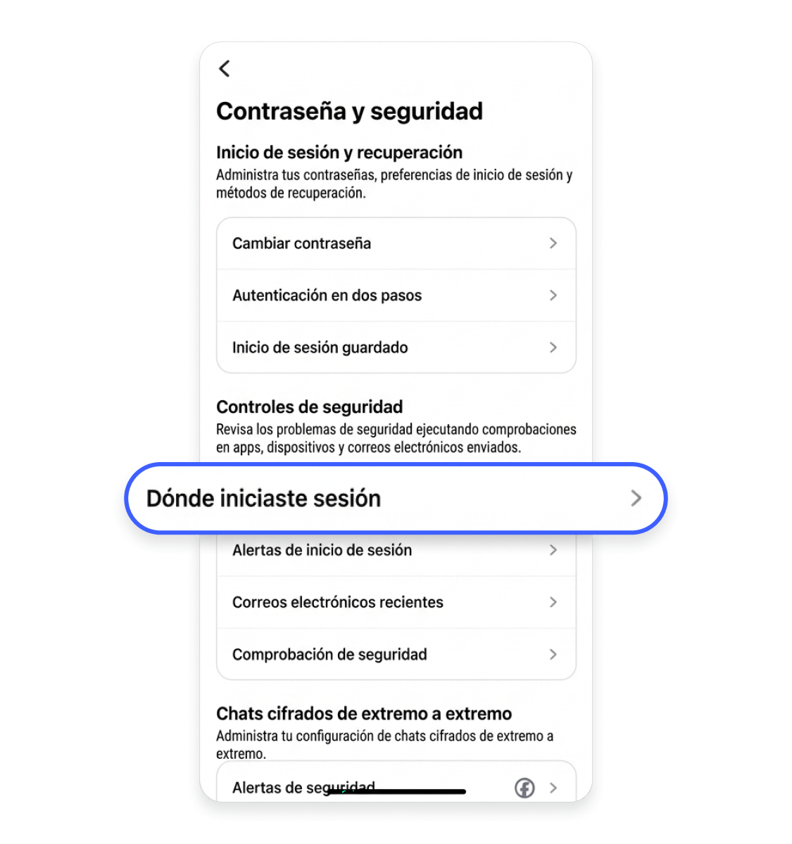 - 2.Cierra sesiones activas: entra periódicamente a "Configuración > Seguridad" y revisa en qué dispositivos está abierto tu Facebook. Si hay uno que no reconoces, ciérralo de inmediato.