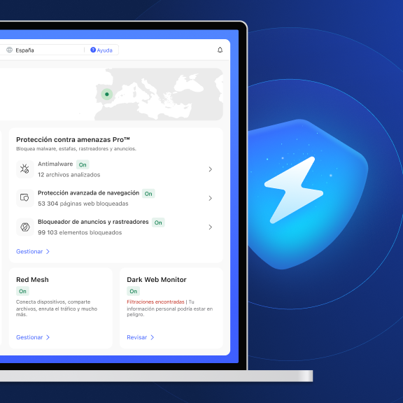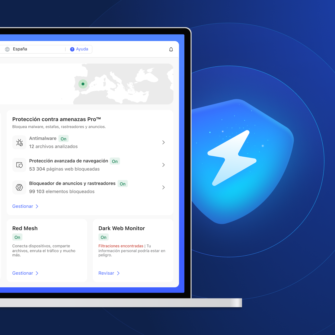 La función Protección contra amenazas Pro™ es una herramienta antimalware integrada directamente en la app de NordVPN. Bloquea las descargas maliciosas, las páginas web de phishing, los anuncios molestos y los rastreadores para protegerte online. ¿Lo mejor? La Protección contra amenazas Pro™ funciona incluso aunque no tengas una conexión VPN activa.