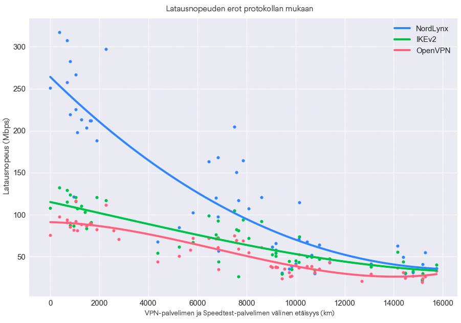 Jokainen piste kuvaajalla edustaa keskimääräistä latausnopeutta VPN-palvelimen ja Speedtest-palvelimen etäisyydellä. Näemme jotain jännittävää: jos yhdistät VPN-palvelimeen, joka on lähellä sinua, ja lataat sisältöä sisältöpalvelimelta, joka on maksimissaan muutaman tuhannen kilometrin säteellä, voit odottaa jopa kaksi kertaa nopeampia latausnopeuksia NordLynxillä! Mitä pidemmäksi etäisyys kasvaa, sitä pienemmiksi erot latausnopeuksissa tietenkin muodostuvat.