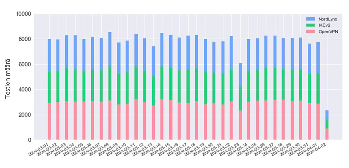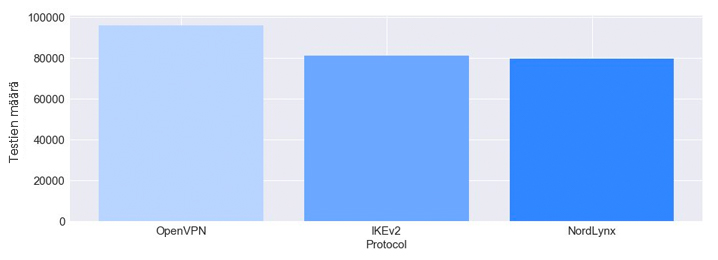 Kuten yllä olevasta kaaviosta näkyy, OpenVPN:llä tehtiin hieman enemmän testejä kuin kahdella muulla protokollalla. Tämän selittää epätasainen palvelimien jaottelu protokollaa kohden verkostossamme. Tällä hetkellä OpenVPN on suosituin protokolla NordVPN-käyttäjien keskuudessa. Näin ollen tarjoamme myös enemmän OpenVPN:ää tukevia palvelimia, kuin IKEv2:ta tai NordLynxiä tukevia palvelimia.