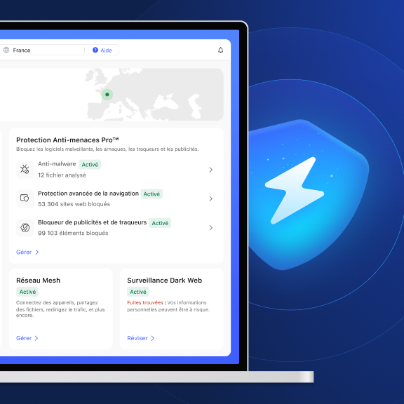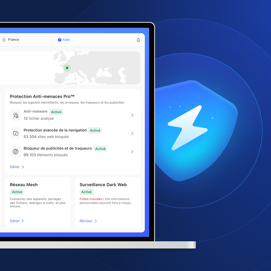 Protection Anti-menaces Pro™ est un outil anti-malware intégré directement à l’application NordVPN. Il vous protège en ligne en bloquant les téléchargements malveillants, les sites d’hameçonnage, les publicités intrusives et les traqueurs. Et le meilleur dans tout cela ? Protection Anti-menaces Pro™ fonctionne même sans connexion VPN active.