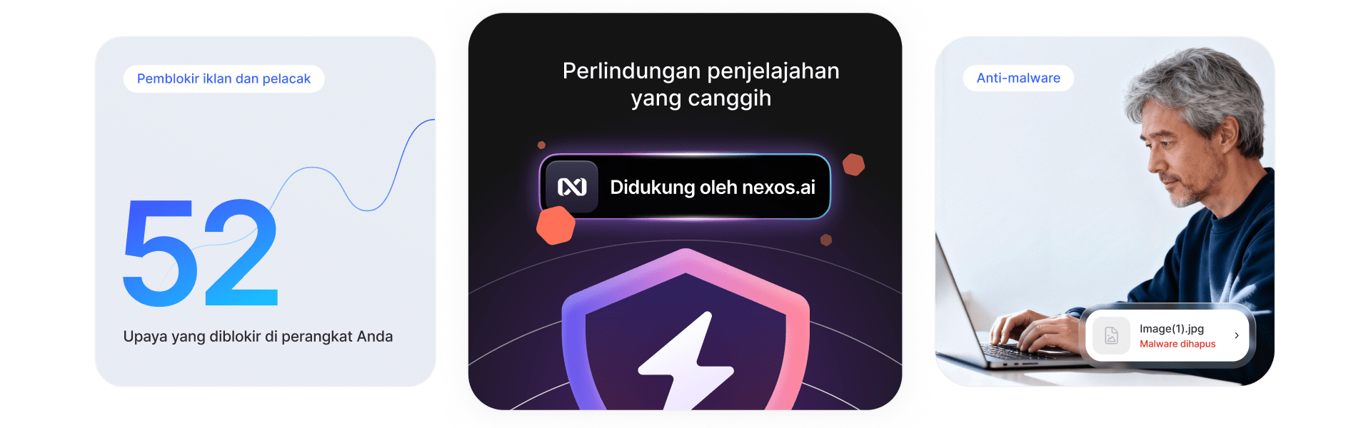 Threat Protection Pro™ adalah alat antivirus yang kuat, efektif, dan ringan. Ini adalah fitur keamanan dunia maya yang terintegrasi langsung ke aplikasi NordVPN, membuat penjelajahan Anda lebih aman dan lancar sekaligus melindungi Anda dari phishing dan ancaman dunia maya lainnya. Jelajahi manfaat yang ditawarkan fitur paling canggih kami.