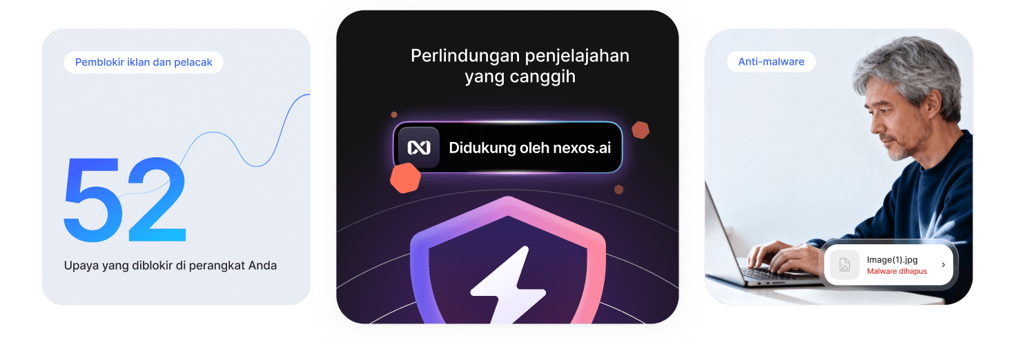 Dengan Threat Protection Pro™, Anda merasakan penjelajahan yang lebih aman dan lebih cepat tanpa gangguan visual. Blokir dan cegah pelacak mengikuti Anda di internet dan mengumpulkan data tentang Anda.