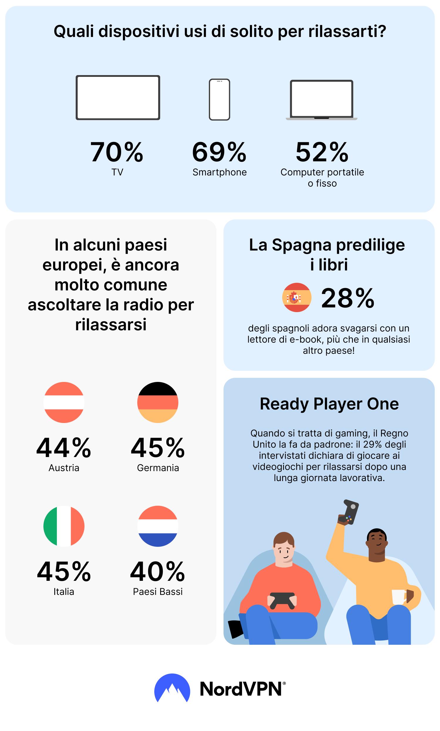 Gli italiani si sono rivelati i più propensi a utilizzare la tecnologia per rilassarsi: il 69% ha dichiarato di farlo alcune volte al giorno. All'estremo opposto c'è la Svizzera, dove meno del 50% degli intervistati ha affermato di aver usato un dispositivo per rilassarsi più di una volta durante la giornata.