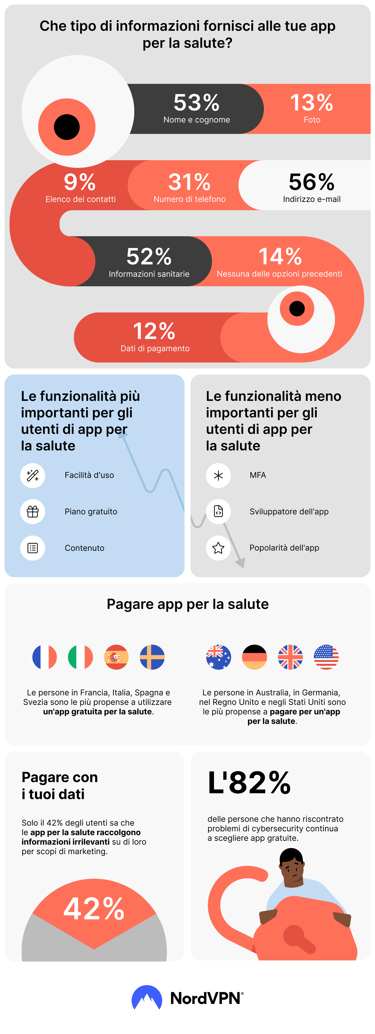 Per quanto riguarda il monitoraggio di varie metriche, il 49% delle persone intervistate ha utilizzato app per tracciare almeno una delle attività elencate nel sondaggio. Fanno eccezione la Malesia, la Francia, la Spagna, gli Stati Uniti e la Svizzera, dove più della metà degli intervistati ha utilizzato app di monitoraggio. Svezia e Italia, invece, sono le meno propense a usarle, rispettivamente per il 38% e il 41%.