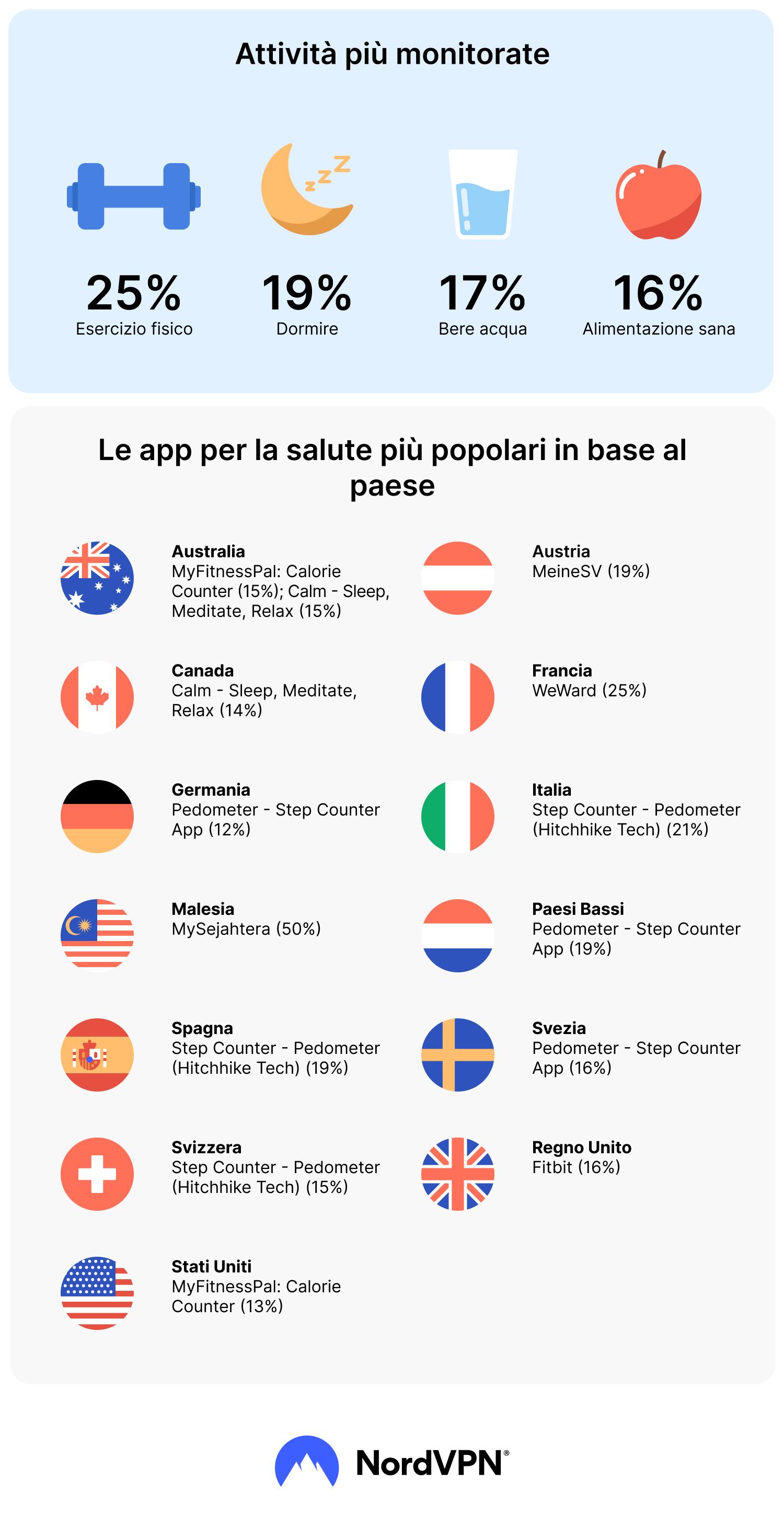 Le attività più monitorate a livello globale sono state l'allenamento (25%), il sonno (19%), l'acqua potabile (17%) e l'alimentazione sana (16%).
