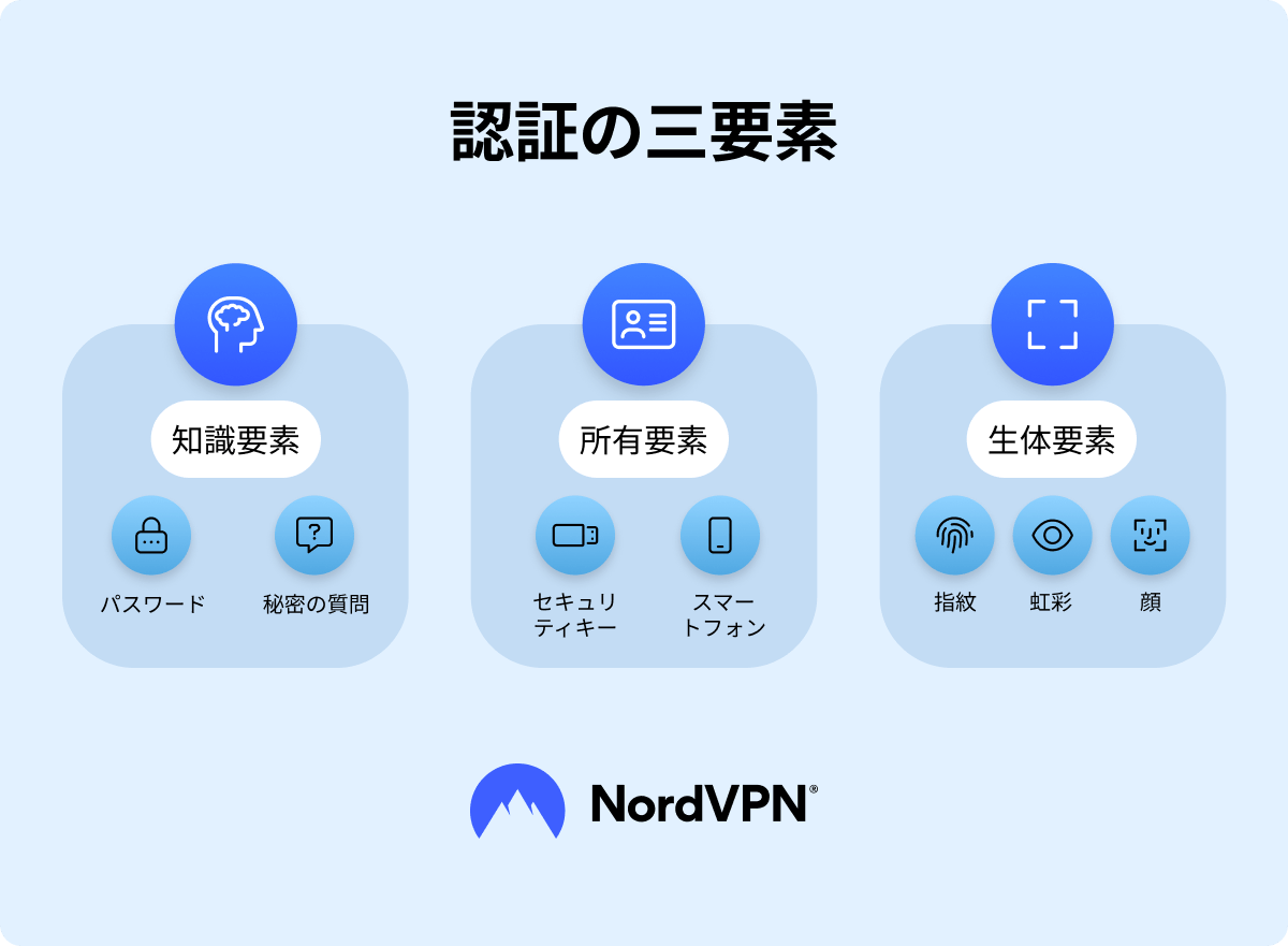 二要素認証は、次の3つの認証要素のうち2つを組み合わせて本人確認を行います。