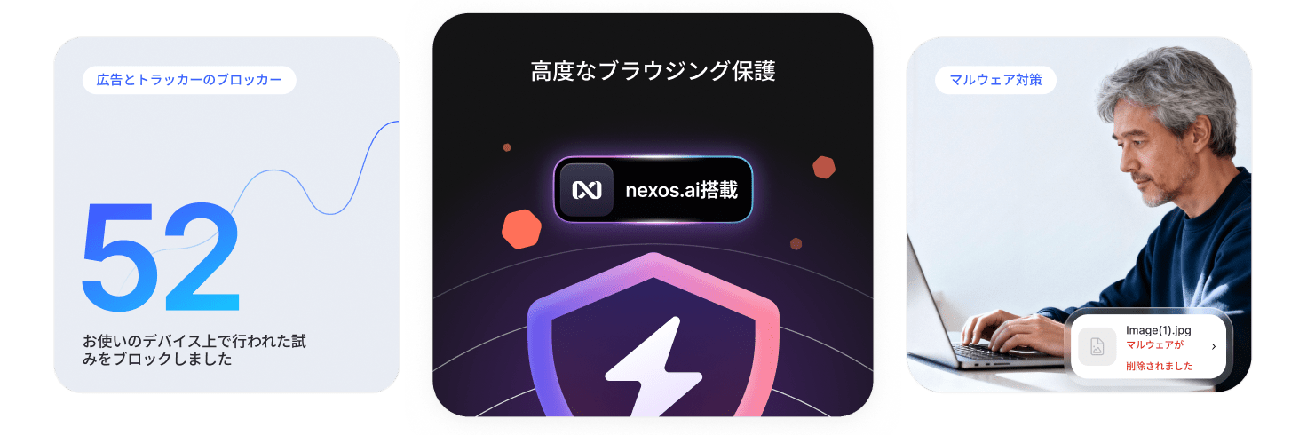 脅威対策Pro™を利用すると、視覚的な煩わしさもなく、より安全で高速なブラウジングを体験できます。広告をブロックし、トラッカーによるインターネット上の追跡や、個人データの収集を防ぎます。