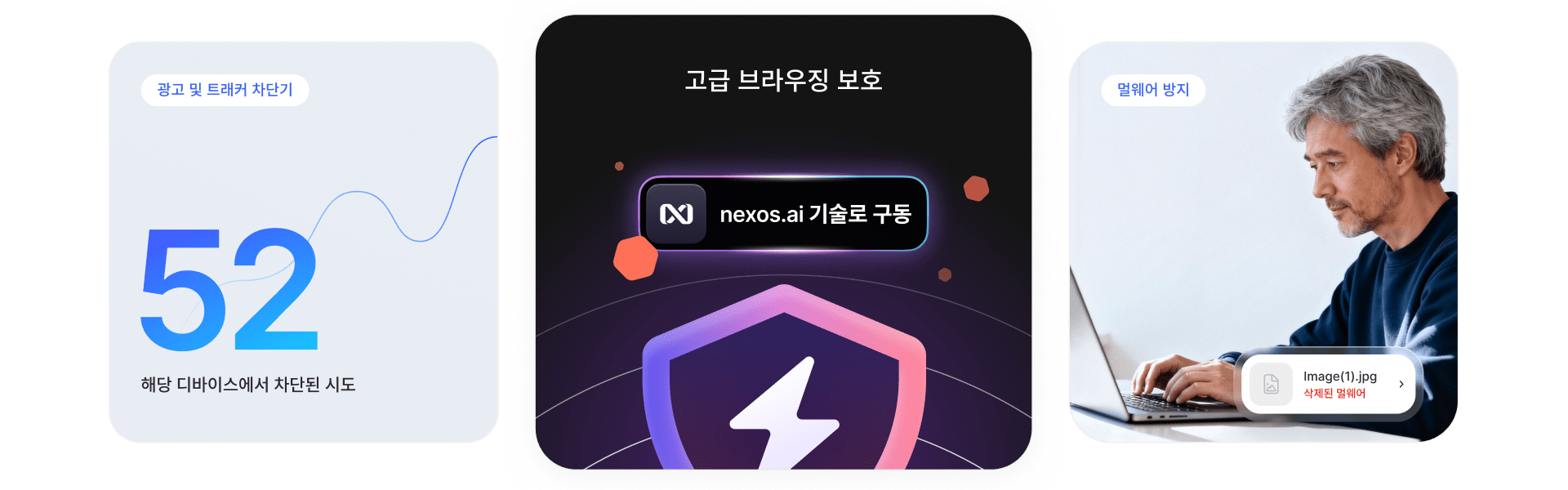 피싱 공격, 멀웨어, 트래커, 광고를 차단하세요.