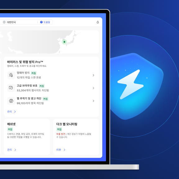 바이러스 및 위협 방지 Pro™는 NordVPN 앱에 직접 통합된 악성 소프트웨어 방지 도구입니다. 악성 다운로드, 피싱 사이트, 침입성 광고 및 추적기를 차단하여 온라인에서 사용자를 보호합니다. 가장 좋은 점은 무엇일까요? 바이러스 및 위협 방지 Pro™ 기능은 VPN 연결 없이도 작동합니다.