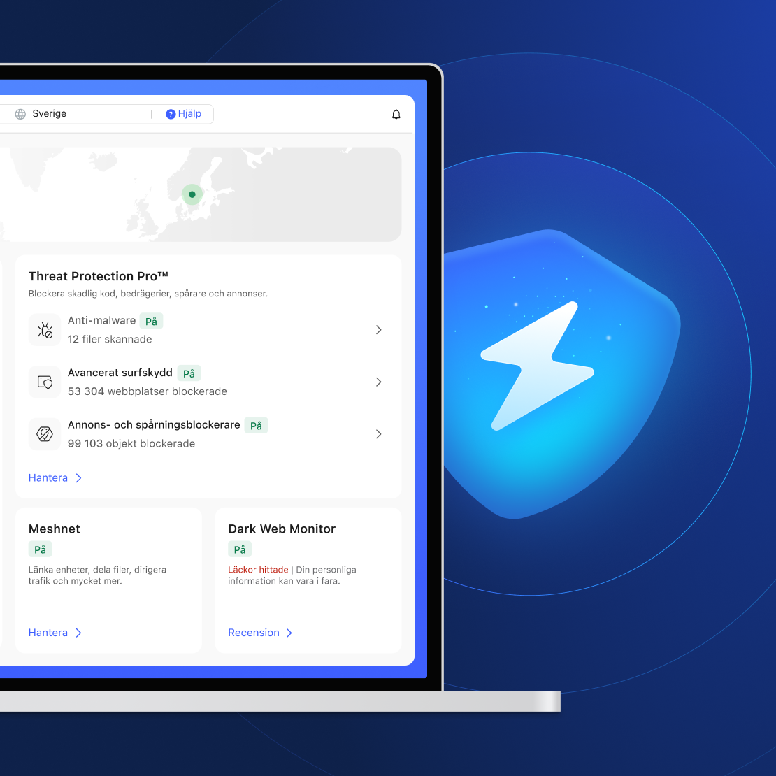 Threat Protection Pro™ är ett verktyg mot skadlig programvara som är integrerat direkt i NordVPN-appen. Det håller dig säkrare på nätet genom att blockera skadliga nedladdningar, nätfiske, påträngande annonser och spårare. Det bästa av allt? Threat Protection Pro™ fungerar även utan en aktiv VPN-anslutning.