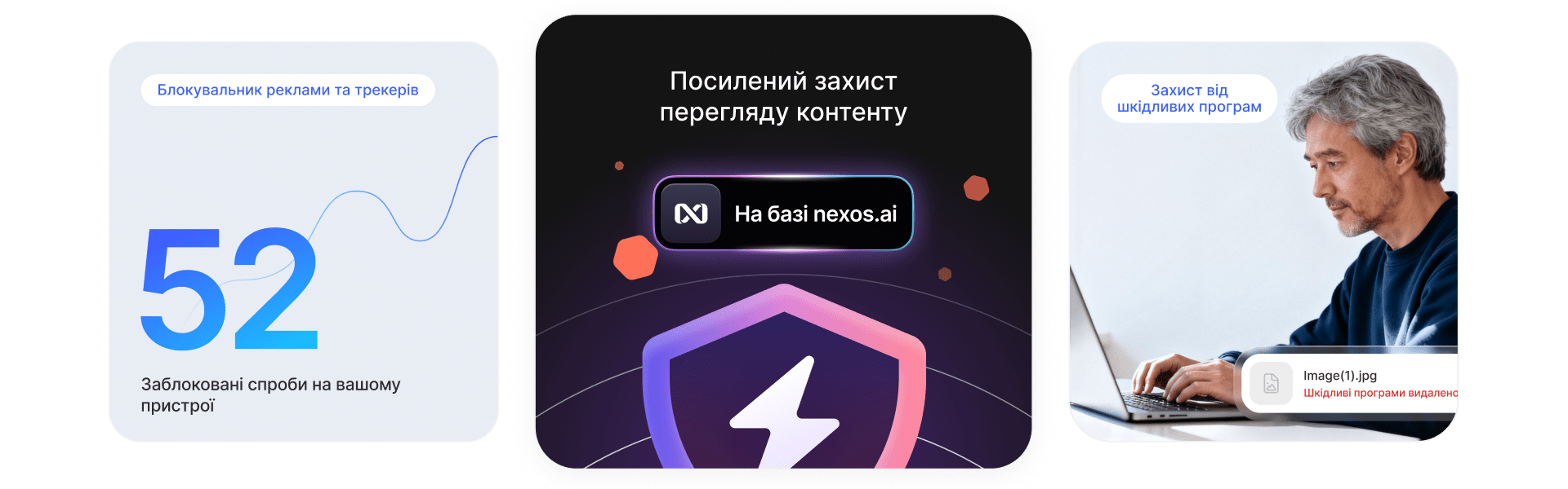 Блокуйте фішинг, шкідливі програми, трекери й рекламу.